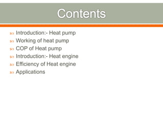 The document discusses heat pumps and heat engines. It explains that a heat pump uses mechanical energy to transfer heat from one place to another, with a coefficient of performance (COP) measuring its efficiency. A heat engine absorbs heat to do work on its surroundings, with its efficiency measured by how much work it produces relative to the heat absorbed. Common applications of heat pumps include heating, ventilation and air conditioning systems, while examples of heat engines are steam engines and internal combustion engines.