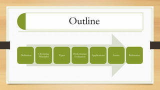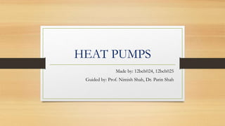 Heat pumps are devices that move thermal energy in the opposite direction of spontaneous heat flow by absorbing heat from a cold space and releasing it to a warmer one. There are two main types of heat pumps - vapor compression cycles which use a compressor to move heat and vapor absorption cycles which use a heat source like gas or steam instead of electricity to run the pump. Heat pumps have various applications like space heating and cooling, domestic hot water, industrial processes, and more. They are evaluated based on their coefficient of performance and energy efficiency. While efficient when temperatures are similar, noise from mechanical components and efficiency limits due to thermodynamics present issues.