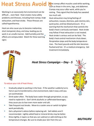 The document provides tips for workers to prevent heat stress such as drinking water, taking breaks in cool areas, monitoring urine color, and reporting any issues to supervisors. It describes symptoms of heat cramps, heat exhaustion, and heat stroke and emphasizes that heat stroke is a medical emergency requiring immediate treatment and cooling of the body. Risk factors for heat stress are discussed including age, weight, fitness level, and recent illness; responsibilities of workers and supervisors are also outlined.