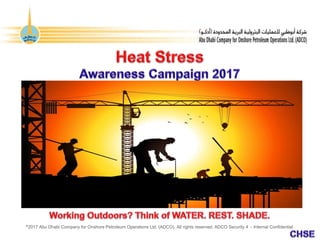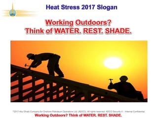 This document contains confidential information from Abu Dhabi Company for Onshore Petroleum Operations Ltd. (ADCO) regarding health and safety topics such as heat illness, sweat glands, emergency contact numbers, and a disclaimer stating the document is confidential and for internal use only. It provides temperature ranges and classifications for heat-related illnesses from mild to severe, including heat rash, heat syncope, heat cramp, heat exhaustion, and heat stroke.