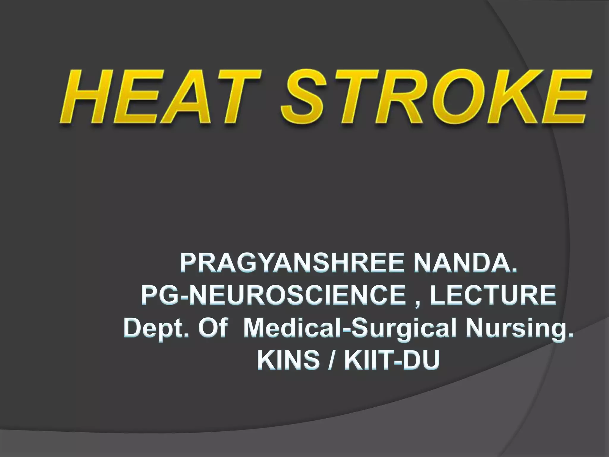 Heat stroke is an acute medical emergency caused by the body's inability to regulate temperature, usually occurring during heat waves accompanied by high humidity. Symptoms include confusion, high body temperature over 105°F, dry hot skin, absence of sweating, fast breathing, low blood pressure, and fast heart rate. Most deaths from heat stroke are in the elderly. Treatment focuses on rapidly reducing the person's temperature to 102°F using methods like cool baths, sheets, and fans while closely monitoring their vital signs. Patients must avoid immediate reexposure to heat and are advised on preventing future heat stroke through hydration, loose clothing, and limiting activity in hot weather.