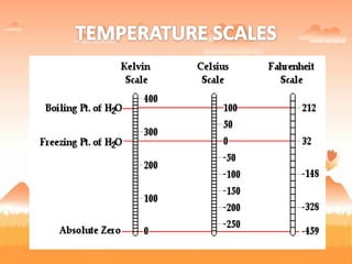 1. The document discusses key concepts in heat and thermodynamics including temperature, heat transfer mechanisms, thermal expansion, and phase changes.