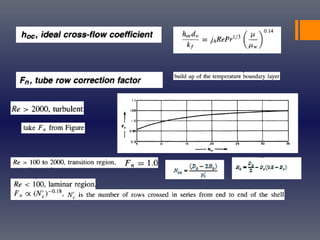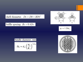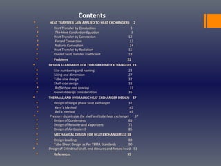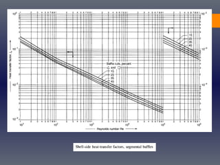 This document provides an overview of heat transfer principles and their application to the design of heat exchangers. It discusses the three main modes of heat transfer (conduction, convection, and radiation) and introduces concepts like heat transfer coefficients. Design considerations for shell and tube heat exchangers are covered, including sizing standards, tube/shell geometry, baffling, and hydraulic performance. Methods for designing single-phase and multiphase exchangers are presented, such as Kern's method and Bell's method. The document concludes with brief discussions on condenser, reboiler, and air cooler design.