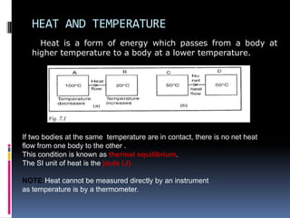 Heat can be transferred through three modes: conduction, convection, and radiation. Conduction requires physical contact between objects and involves heat transfer through vibrations in solids. Convection involves the movement of heated fluids like liquids and gases. Radiation transfers heat through electromagnetic waves and does not require a medium. Different materials conduct heat at different rates depending on properties like their molecular structure. Metals are generally good conductors while gases are poor conductors due to low molecular cohesion. Proper use of these conductive properties allows for efficient heat transfer in applications like cooking.