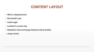 The document outlines key concepts in heat transfer, including Wien's Displacement Law, Kirchhoff's Law, solid angle, Lambert’s cosine law, and radiation heat exchange between two black bodies. It explains how various laws relate temperature and wavelength for thermal radiation, the principles of emissivity and absorptivity, and the geometry of solid angles in radiation. Additionally, it discusses the energy exchange between bodies based on surface area, distance, and temperature differences.
