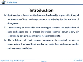 This document describes a student project that aims to experimentally analyze heat transfer enhancement using different types of inserts. It will investigate various factors that influence heat transfer for each insert type across a range of Reynolds numbers. The project will also compare experimental and software analysis results for different inserts. Heat transfer can be enhanced through passive surface and flow manipulation techniques that interrupt the boundary layer, create swirl flow, or modify the flow path. Enhanced heat transfer allows for more compact and efficient heat exchanger design.