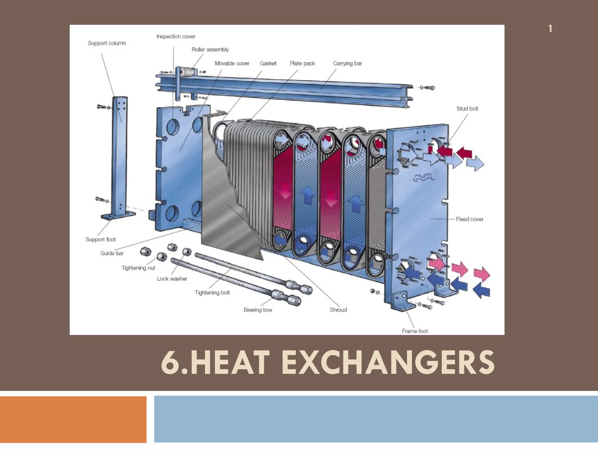 The document provides an overview of heat exchangers, defining them as devices that transfer heat between fluids at different temperatures and detailing their various applications such as in heating and cooling, power production, and chemical processing. It categorizes heat exchangers by flow arrangement, construction type, and transfer processes, while also discussing analysis techniques like the log mean temperature difference (LMTD) and effectiveness-number of transfer units (ε-NTU) methods. Furthermore, it illustrates the equations used for calculating heat transfer rates and temperatures for different types of heat exchangers.