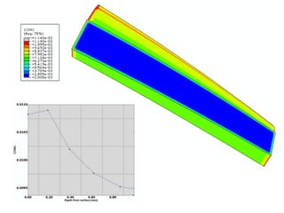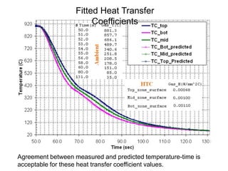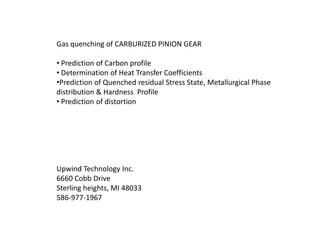 The document summarizes the simulation of gas quenching of a carburized pinion gear. Different heat transfer coefficients were applied to three zones of the gear to predict temperature profiles, residual stresses, phase distributions, and hardness profiles. The simulation results matched measured temperature data and predicted distortion of 0.0213mm radially after quenching.