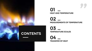 This document discusses heat, temperature, and different temperature scales. It provides details on how temperature is measured using different types of thermometers like clinical, digital, and laboratory thermometers. It explains that temperature is a measure of how hot or cold something is and discusses the common temperature scales used - Celsius, Fahrenheit, and Kelvin. Precautions for using different thermometers are also outlined.