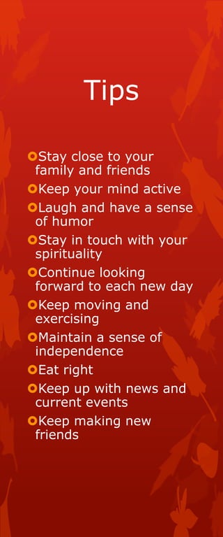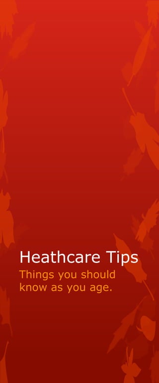 The document provides 10 healthcare tips for aging, including staying close with family and friends, keeping one's mind active, maintaining a sense of humor, continuing spiritual practices, looking forward to each new day, exercising, maintaining independence, eating healthy, keeping up with current events, and making new friends. These tips are meant to help people age well based on lessons learned from centenarians who have lived long and fulfilling lives.