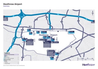 This document provides an overview and map of Heathrow Airport Terminal 3, including information about check-in, departures, arrivals, and transportation options. The summary includes: