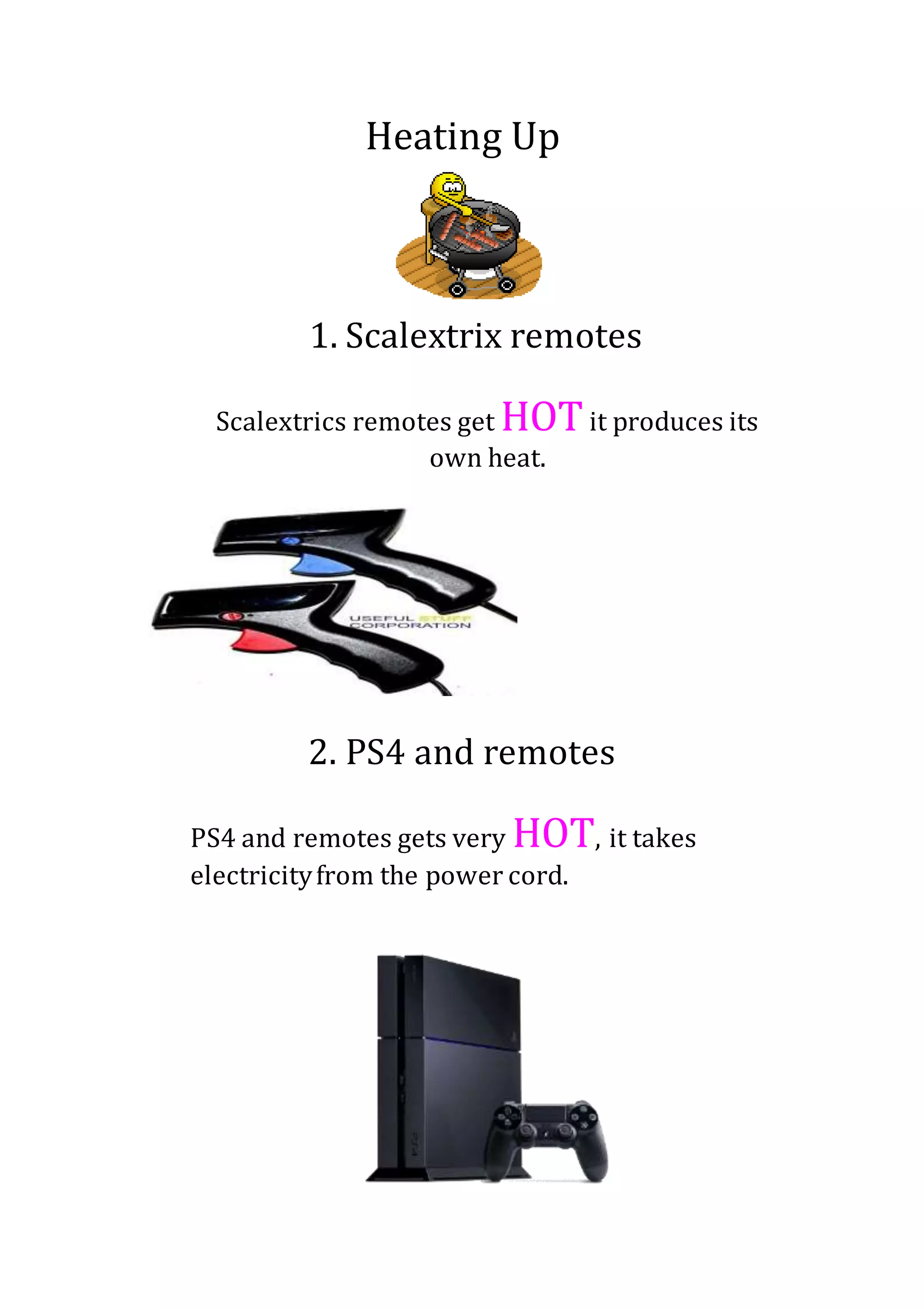 Scalextrix remotes, PS4 controllers, and grills all get hot but through different means. Scalextrix remotes produce their own heat, PS4 controllers get hot from the electricity running through them, and grills get extremely hot from burning gas.