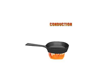 Heat is the transfer of thermal energy from a warmer object to a cooler one. It is a process, not a physical thing that can be contained. Thermal energy is the total kinetic and potential energy of an object's molecules. Heat transfer occurs through three main methods: conduction, convection, and radiation. Conduction involves the direct transfer of heat between objects in contact through particle vibration; it is most effective in solids and fluids.