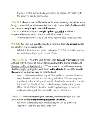 The document discusses heaven as a future destination for Christians based on several Bible passages. It summarizes that heaven is where God resides and where Jesus went to prepare a place for believers. When Jesus returns, believers who have died will be resurrected and both the living and dead will be taken up together to meet Jesus in the air and be with him forever in heaven. The Bible describes heaven as a place of rest and reward for works done on earth.