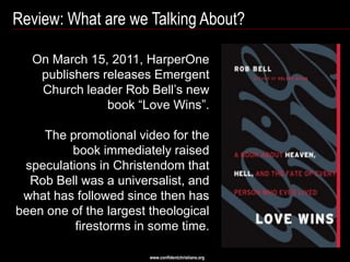 This document provides a summary and analysis of Rob Bell's book "Love Wins" and the theological debate it sparked regarding universalism. It examines several biblical passages commonly cited in support of universalism and provides counterpoints arguing they do not support the idea that all people will ultimately be saved. The document questions whether Bell's portrayal of God as potentially unable to achieve His purposes is consistent with Scripture. Overall, it aims to analyze Bell's theology in light of biblical teachings on salvation, judgment, and the sovereignty of God.