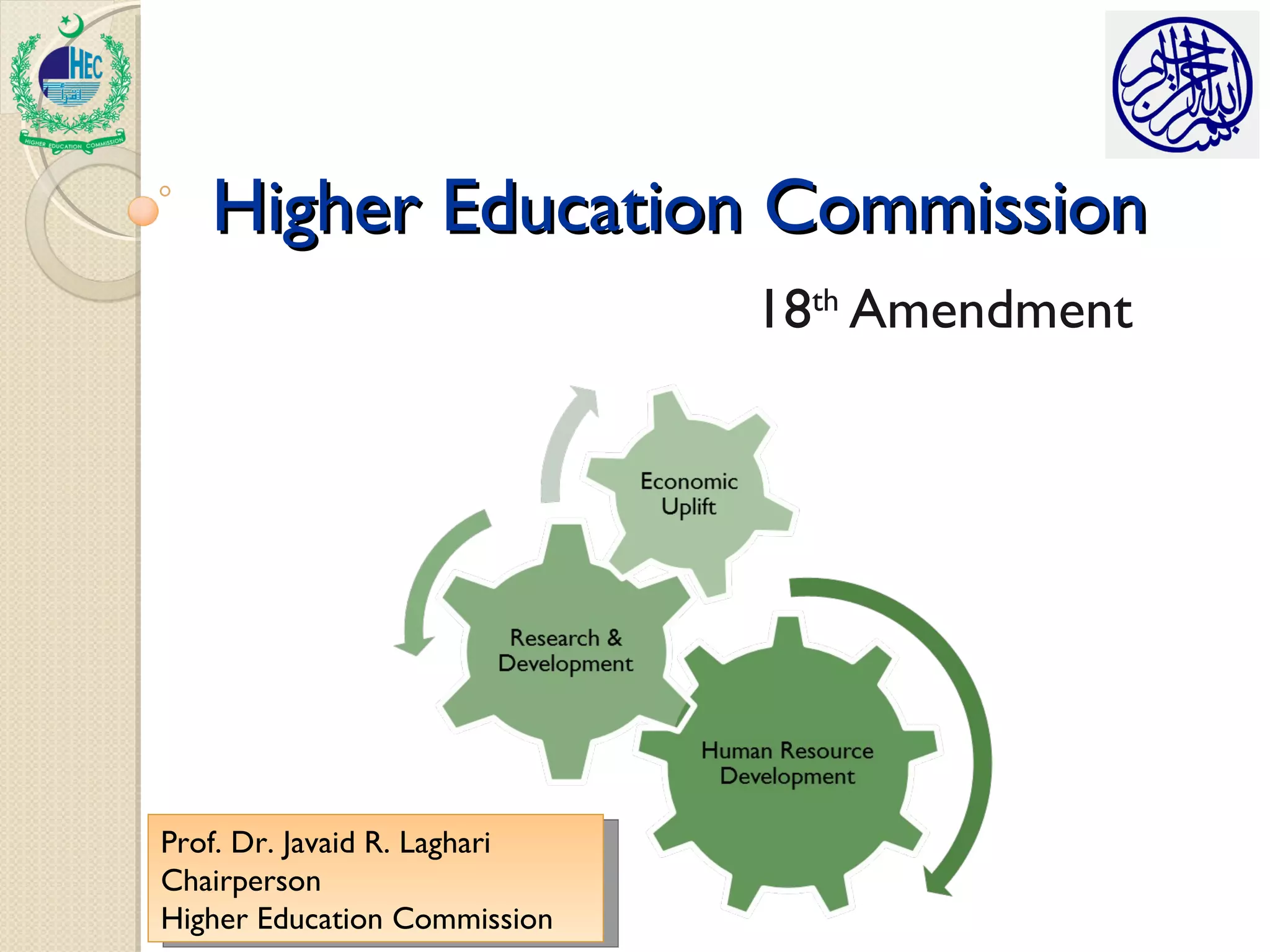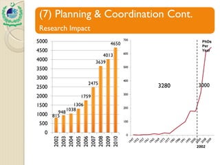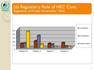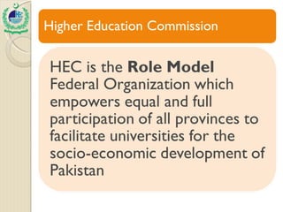 The document discusses the role and powers of the Higher Education Commission of Pakistan established in 2002. It outlines that the HEC is responsible for developing policies and priorities for higher education, accrediting programs and departments, granting charters to universities, and determining degree equivalences. It also details how the HEC allocates funding to universities based on factors like enrollment, research output, and development projects. The 18th amendment supports the HEC's current role in coordinating higher education across Pakistan.