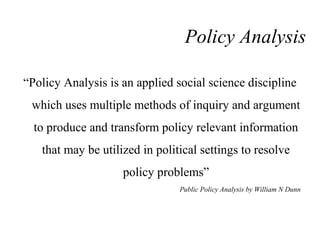 Policy analysis is an applied social science discipline that uses multiple methods to produce and transform policy-relevant information for use in political settings to resolve policy problems. It aims to improve the basis for policymakers' judgments through systematic analysis that generates and presents information by drawing on various social science disciplines. The rational model of policy analysis involves six steps: 1) verifying and detailing the problem, 2) establishing evaluation criteria, 3) identifying alternative policies, 4) evaluating and comparing alternatives, 5) selecting the best policy, and 6) monitoring the selected policy. When applied to analyze devolution of Pakistan's Higher Education Commission following the 18th Amendment, the alternatives identified were: no devolution as status quo, complete devolution to provinces,