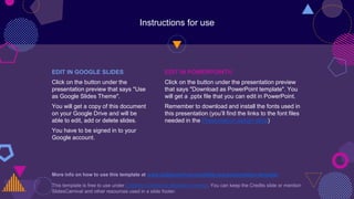 This document provides instructions for editing a presentation template in PowerPoint or Google Slides. It explains that the user can download the PowerPoint file template to edit in PowerPoint, or use the template as a Google Slides theme. The document also contains sample presentation content including titles, text, images, charts, and credits.