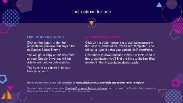 This document provides instructions for editing a presentation template in either PowerPoint or Google Slides. It explains that to edit in PowerPoint, the user should download the template file and install any necessary fonts. To edit in Google Slides, the user should click the button to make a copy in their Google Drive. The document also contains sample presentation content including titles, text, images, charts, and other visual elements.