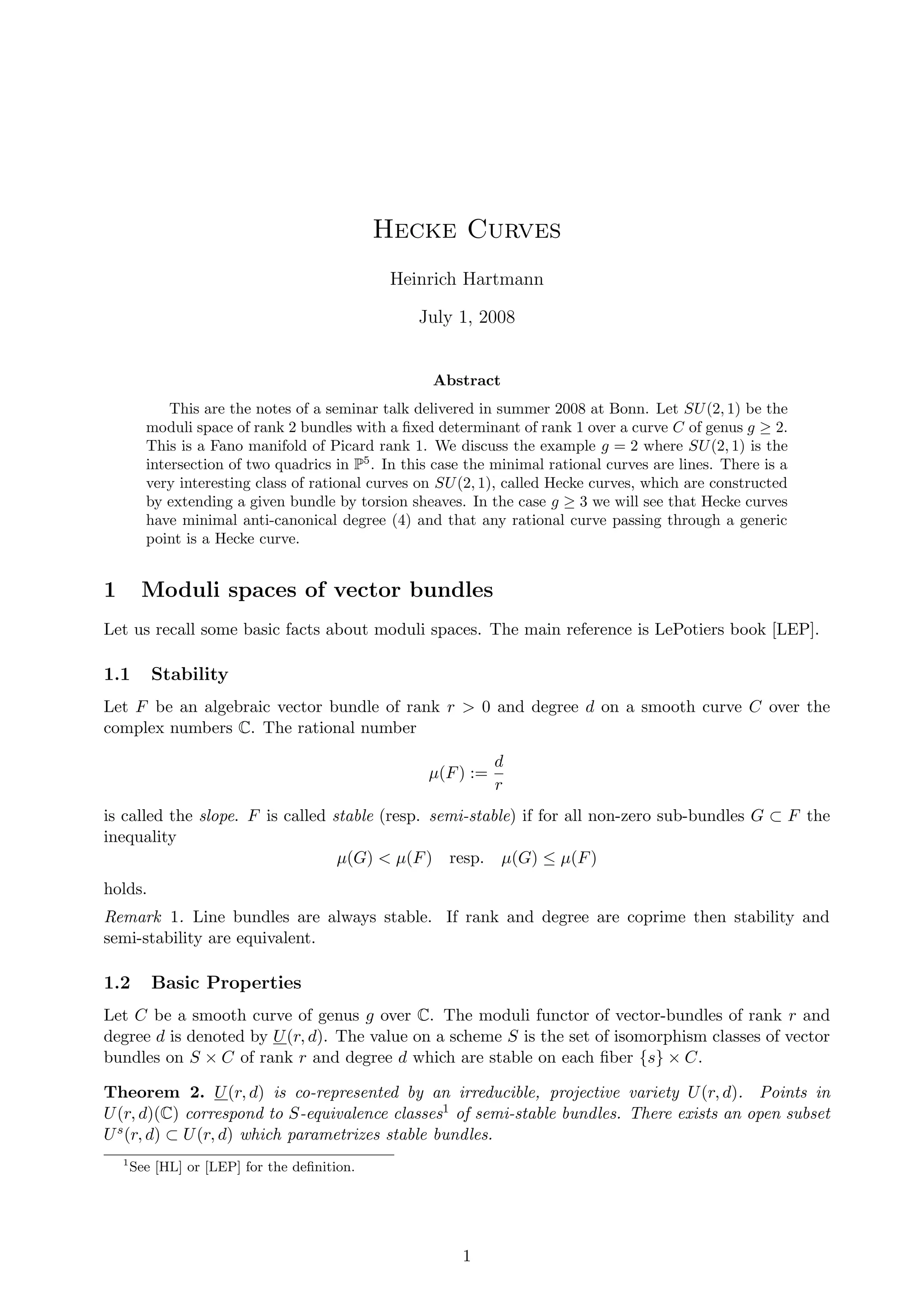 This document presents notes from a seminar talk on Hecke curves and moduli spaces delivered by Heinrich Hartmann in 2008. It discusses Fano manifolds, particularly the moduli space SU(2,1) for vector bundles over curves of genus g ≥ 2, analyzing their construction and properties, including the existence of minimal rational curves known as Hecke curves. The document covers various mathematical concepts such as stability of vector bundles, Poincaré bundles, and the implications of their properties in the context of algebraic geometry.