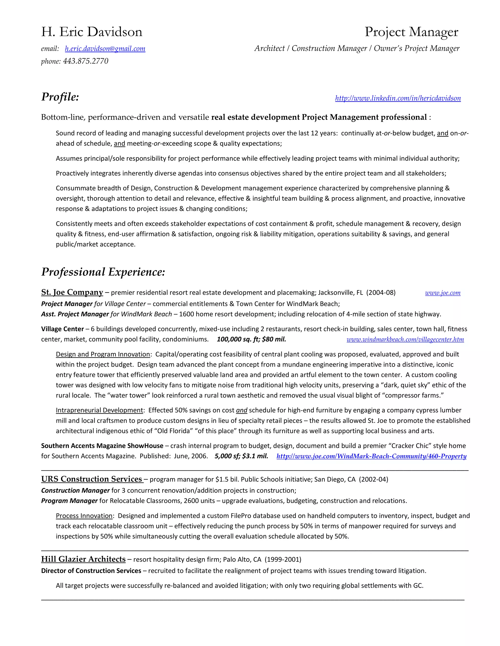 H. Eric Davidson is an experienced project manager specializing in real estate development. He has led numerous successful projects on time and under budget across various sectors including hospitality, commercial, and government. His skills include budgeting, scheduling, scoping, design, construction management, and team leadership. He currently works as an independent architect, construction manager, and owner's project manager.