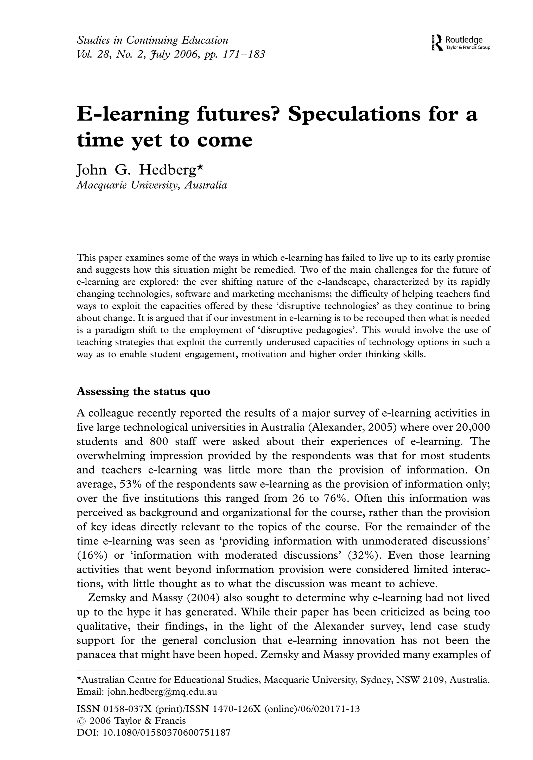 This document discusses the future of e-learning and how it can be improved. It examines how e-learning has failed to live up to early expectations and suggests the need for a paradigm shift to "disruptive pedagogies" that better exploit technology. Two main challenges are explored: the rapidly changing e-landscape of technologies and finding ways for teachers to use these technologies. The document reviews studies showing that e-learning is mainly used for information provision rather than interactive learning. It argues disruptive technologies and pedagogies are needed for e-learning to achieve its potential to engage students and improve higher-order thinking.