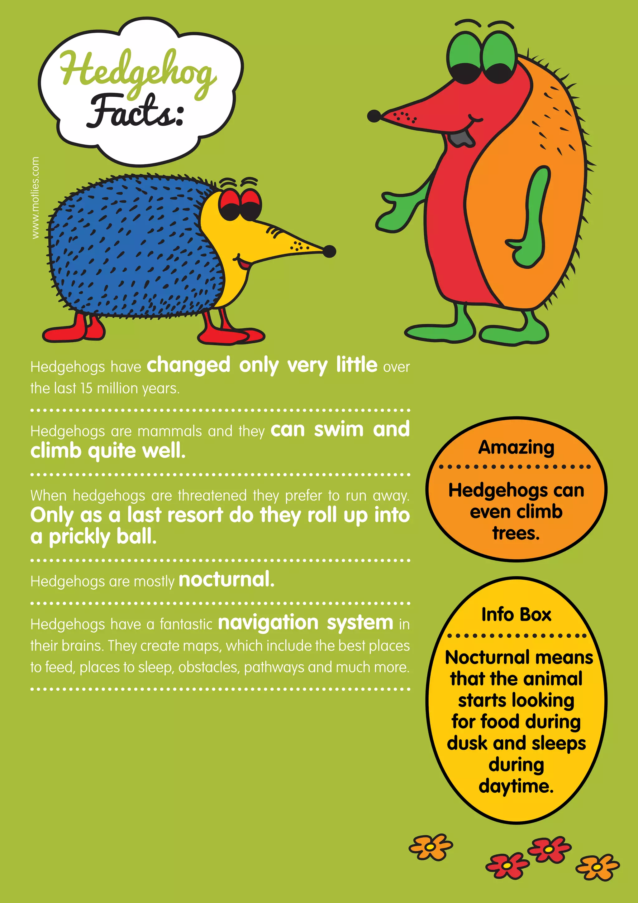 Hedgehogs have changed little over 15 million years. They are nocturnal mammals that can swim, climb, and roll into a prickly ball for defense. Hedgehogs have good navigation skills and use their sense of smell and hearing to find food and nests. They eat insects and small animals and hibernate in cold weather, slowing their metabolism significantly. Hedgehogs live on multiple continents but not in Australia or North America.