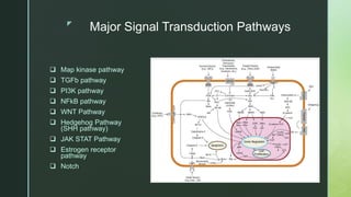 The hedgehog signaling pathway is a key developmental pathway that is conserved across species. It regulates organ formation during embryonic development by controlling cell growth and differentiation. Abnormal activation of the hedgehog pathway has been linked to several human cancers, primarily through mutations in pathway regulators like PTCH and SMO that lead to ligand-independent signaling. Inhibitors of the hedgehog pathway have potential as cancer therapeutics by blocking the activity of proteins like SMO.