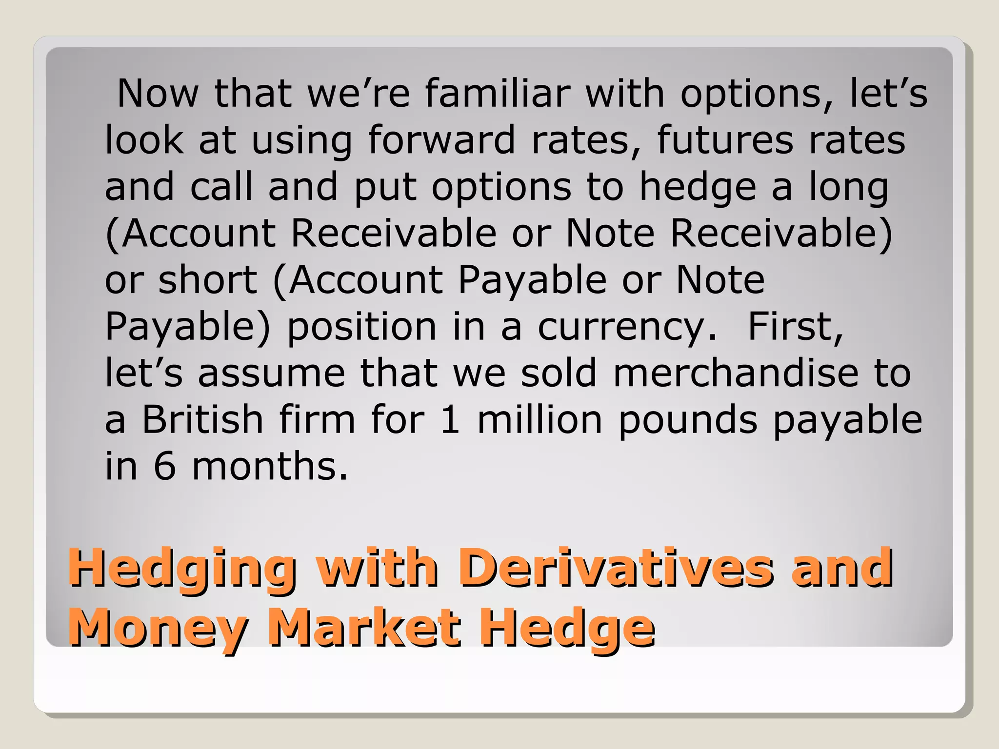 1) The document discusses various hedging strategies using derivatives and money markets to hedge against foreign exchange risk when receiving a payment of 1 million British pounds in 6 months.