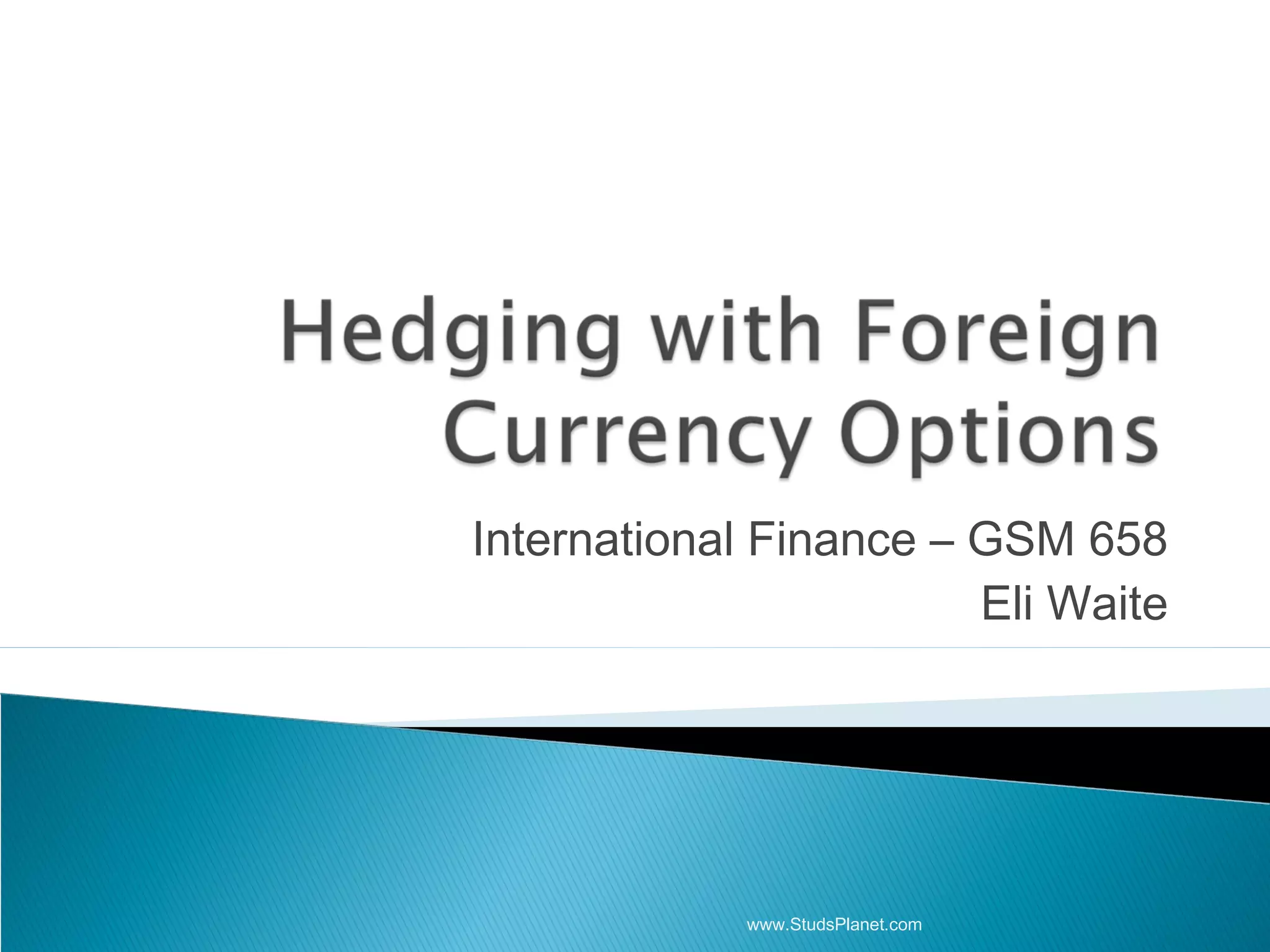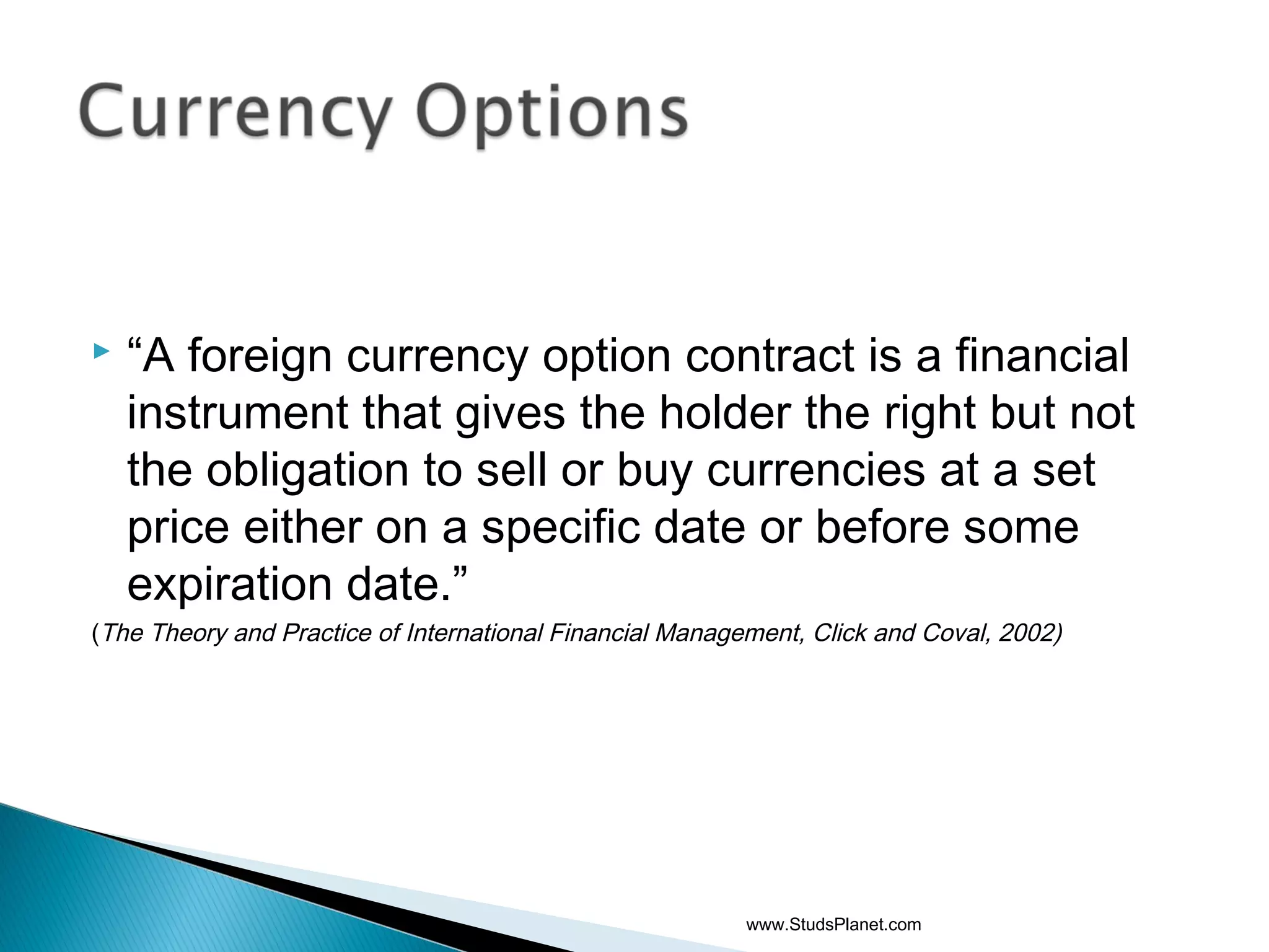 A foreign currency option contract gives the holder the right but not the obligation to buy or sell currencies at a set price on a specific date or before expiration. Options can be used to hedge potential transactions or transactions dependent on uncertain factors by limiting downside risk while allowing upside potential. Call options provide the right to buy a currency while put options provide the right to sell. Standard contract sizes are for 10,000 currency units and options typically expire on the third Friday of the expiration month, with American options exercisable anytime before expiration and European options only at expiration.