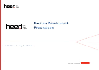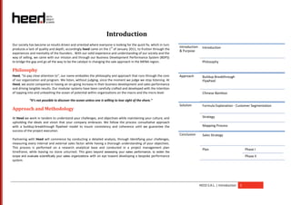 Heed is a consulting firm that aims to increase clients' sales performance through changing their sales approach. The document provides an overview of Heed's philosophy and methodology. It explains that Heed follows a consultative process to understand clients' challenges and objectives. Heed then conducts in-depth analysis and develops a tailored performance system and action plan for clients. The document also includes a sample comparative study analyzing a client's sales data and key metrics to identify opportunities for improvement.