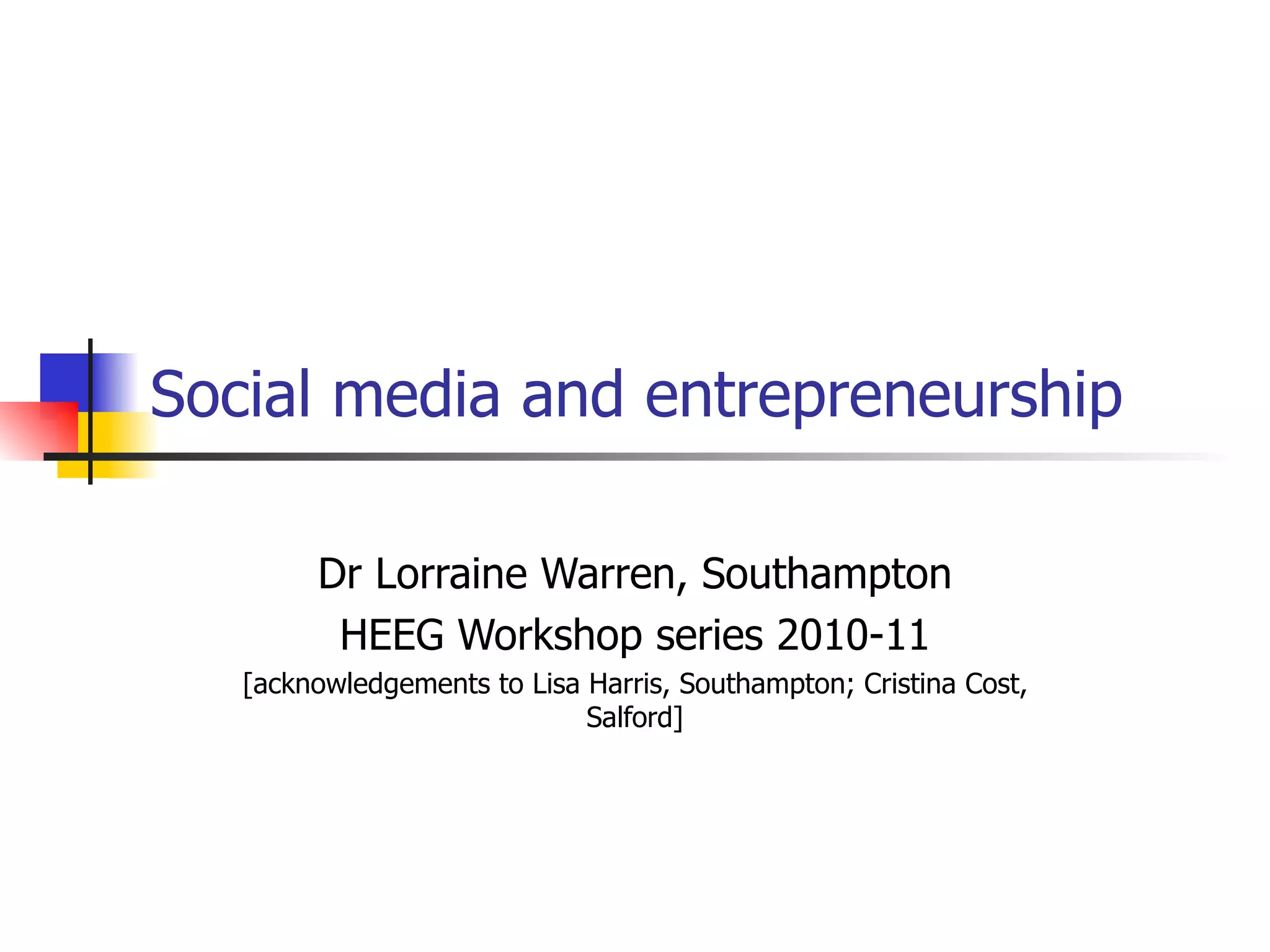 Social media provides benefits for entrepreneurs such as rapidly building networks, identifying opportunities, and amplifying messages. It can be used to build personal brands, launch social media businesses, and organize campaigns. The document discusses examples like a social media company called Liberate Media, two successful social media campaigns for Trafigura and Bletchley Park, and how the hashtag #Twifficiency went viral for one user. It also mentions networks that entrepreneurs can join online.