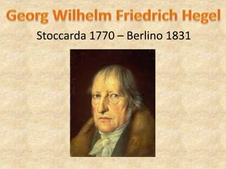 Hegel, filosofo tedesco tra il 1770 e il 1831, è considerato una figura di rilievo nella cultura prussiana e ha influenzato profondamente la filosofia, dando vita a due correnti tra i suoi allievi: i giovani hegeliani di destra e di sinistra. La sua concezione idealistica si oppone al realismo, sostenendo che la realtà è influenzata dall'io e l'importanza della dialettica, che combina razionale e irrazionale, è centrale nel suo pensiero. Hegel ritiene che la storia sia guidata dalla ragione e individua l'individuo come parte integrante dello stato, negando l'idea di un contrattualismo individualista.