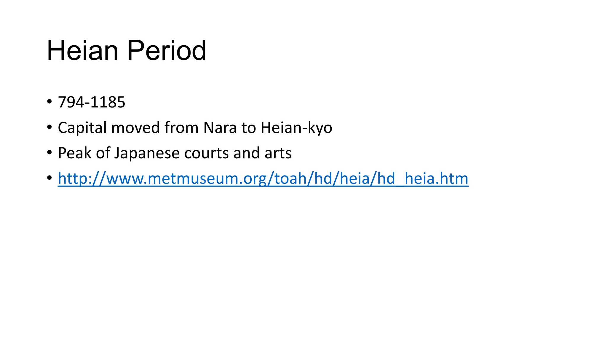 The Heian Period lasted from 794 to 1185 in Japan, during which time the imperial capital was moved from Nara to Heian-kyo, now known as Kyoto. This era marked the peak of aristocratic culture and refinement at the Japanese imperial court, with literature, calligraphy, music, and visual arts all blossoming during this period of relative peace and prosperity.