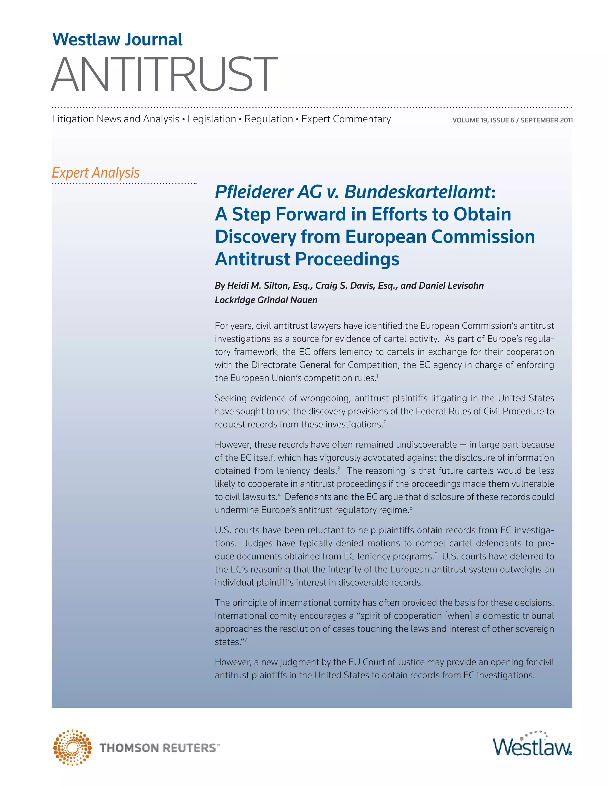This document summarizes a court case, Pfleiderer AG v. Bundeskartellamt, and its implications for obtaining antitrust evidence from European Commission investigations. The European Court of Justice in Pfleiderer ruled that EU competition laws do not preclude granting access to leniency documents to parties seeking damages from antitrust violations. This decision provides an opening for US antitrust plaintiffs to obtain records from EC investigations, as US courts may rebalance their analysis of international comity in such cases. The Pfleiderer ruling also appears to be influencing decisions in national courts within Europe.