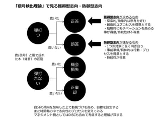 「信号検出理論」で見る獲得型志向・防御型志向 鹿いた 正答 弾打 つ 鹿いない 誤答 鹿(信号)と風で揺れ た木(雑音)の区別 鹿いた 弾打 たな い 鹿いない 獲得型志向が求めるもの ・探索的/抽象的な思考を好む ・創造的なプロセスを得意とする ・短期的にモチベーションを高める 事が得意/持続性は不得意 防御型志向が嫌がるもの ・1つの対象に長く向き合う ・事前準備/具体的な行動・プロ セスを得意とする ・持続性が得意 機会 損失 正棄 却 自分の傾向を加味した上で動機づけを高め、目標を設定する また時間軸の中で志向性のプロセスを変えてみる マネジメント側としてはDiSCも含めて考慮すると理解が深まる