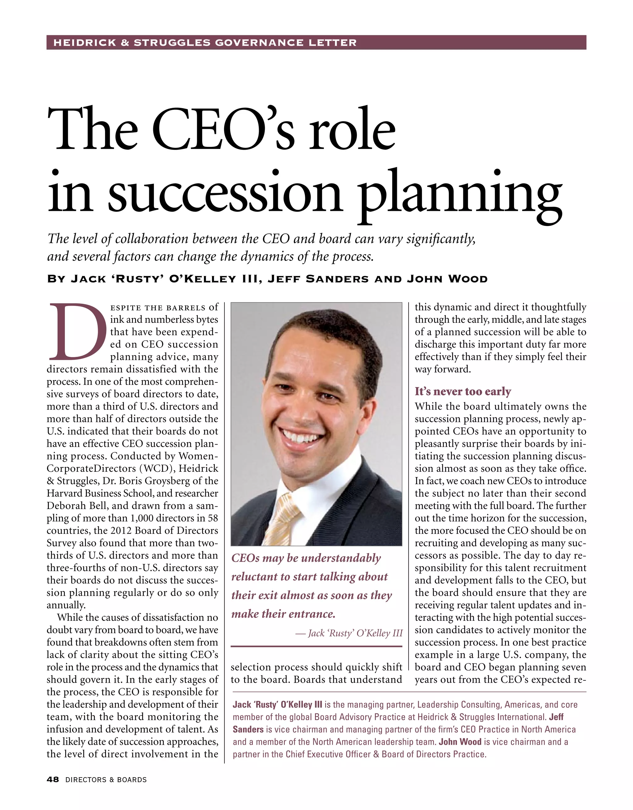 This document discusses the CEO's role in succession planning and outlines the process in three stages: early, middle, and late. In the early stage, the CEO works with the board to identify an emergency successor and develop a skills profile for future CEOs. As the expected succession date approaches, the board becomes more involved in assessing internal and external candidates while the CEO continues mentoring potential successors. In the final stage, the board takes full responsibility for selecting the new CEO from finalist candidates. Effective succession planning requires managing the dynamic between the CEO and board over time.