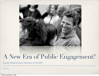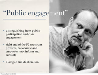 The document discusses the evolving landscape of public engagement, particularly in the context of recent initiatives like Obama's open government memorandum. It emphasizes the importance of active participation and collaboration, rather than mere information dissemination, and outlines efforts involving various organizations to enhance civic engagement. The text also highlights core principles and calls for readiness among practitioners to effectively contribute to public discourse and decision-making.