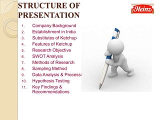 The document presents research on acceptance of Heinz Tomato Ketchup in India. It discusses Heinz's establishment in India, features of its ketchup, substitutes on the market, and provides a SWOT analysis. Research methods included surveys, hypothesis testing, and data analysis of attributes like taste, color, and thickness to understand consumer preferences and determine if color or thickness is more important. The findings provide insights for Heinz to improve marketing and increase market share in India.