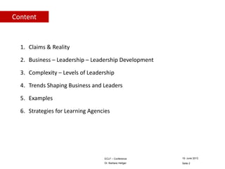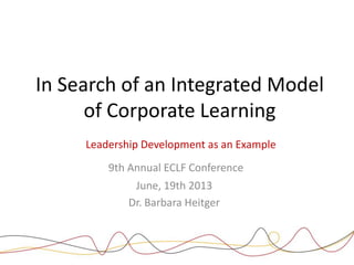 Dr. Barbara Heitger presented at the 9th Annual ECLF Conference on developing an integrated model of corporate learning using leadership development as an example. She discussed the disconnect between claims and reality in leadership development strategies and the need for better alignment between business, leadership, and learning strategies. She also covered trends shaping modern business and leadership, including increased transparency, agility, and collaborative communities. Learning agencies must design programs that account for complexity levels, foster collective learning, and integrate work experiences to develop leaders in this changing environment.