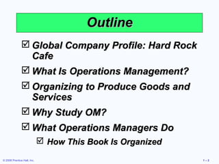 1. It provides learning objectives for the chapter on operations and productivity such as defining operations management, distinguishing between goods and services, and calculating productivity metrics.