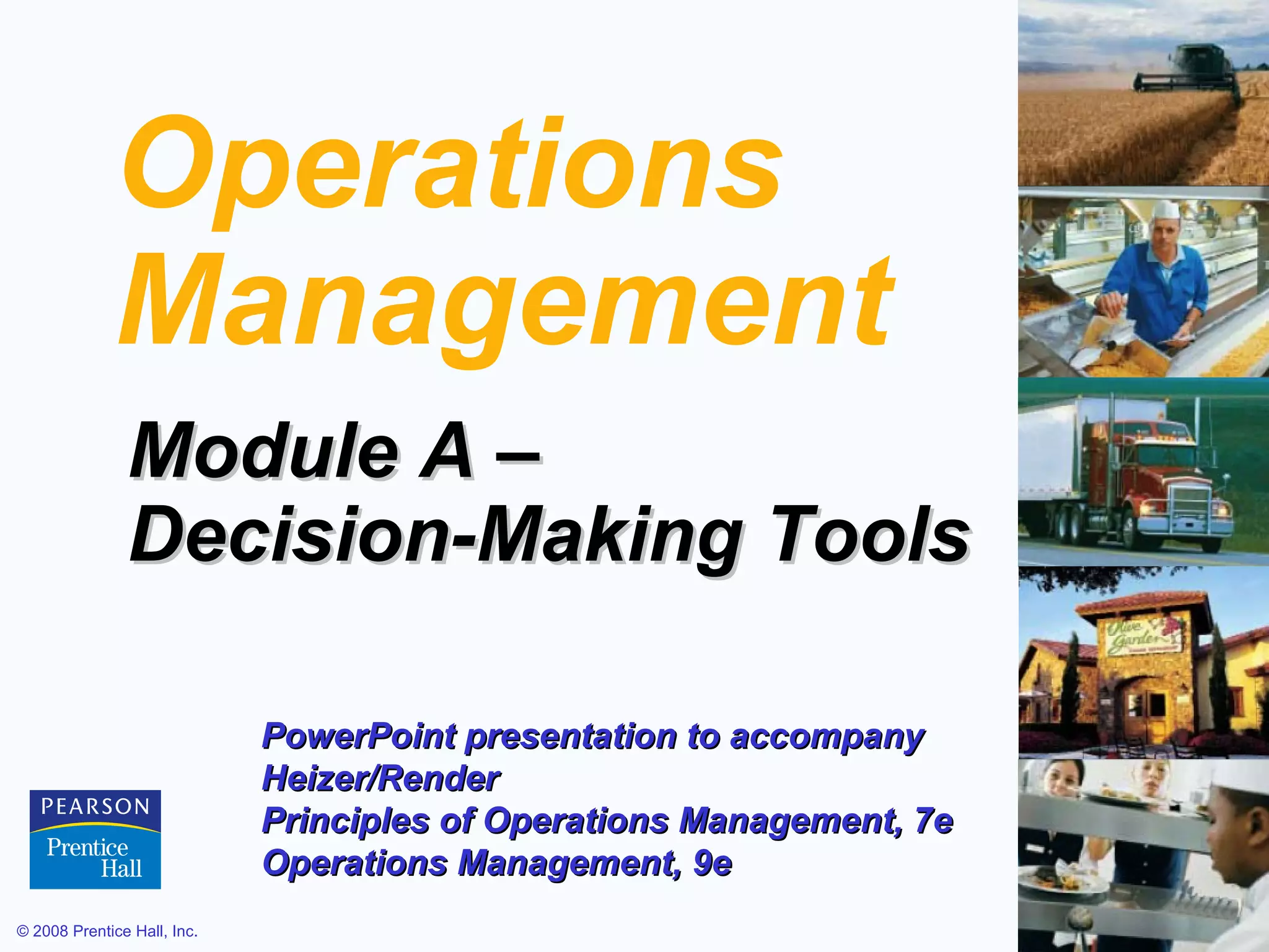 This document outlines the key topics and tools covered in a module on operations management decision-making. It includes an introduction to decision trees, decision tables, and the three types of decision-making environments: uncertainty, risk, and certainty. Formulas for expected monetary value, maximum, minimum and equally likely choices under uncertainty are provided. The document concludes with learning objectives and examples of using decision trees to evaluate sequential and ethical decisions.
