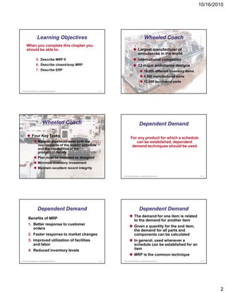 The document outlines key concepts related to material requirements planning (MRP) and enterprise resource planning (ERP). It discusses dependent demand and inventory models, the importance of accurate records and bills of materials in MRP. The summary also explains how MRP determines gross requirements by working through a bill of materials level-by-level using lead times to calculate order releases for components. The goal of MRP and ERP systems is to meet production schedules in a cost-effective manner through integrated planning.