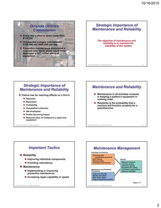 The document discusses maintenance and reliability at Orlando Utilities Commission. It outlines how OUC takes its power plants offline for 1-3 weeks each year and 6-8 weeks every three years for maintenance overhauls. Preventive maintenance is important to reliability and discovered a cracked rotor blade that could have destroyed expensive equipment. The objectives of maintenance and reliability are to maintain the system's capabilities and having redundant components improves reliability.