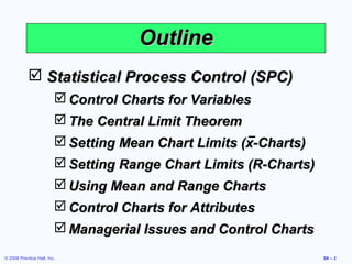 This document outlines the key concepts and steps for statistical process control using control charts. It discusses control charts for variables, which use x-charts to monitor central tendency and R-charts to monitor dispersion. The document explains how to set control limits for these charts using factors from tables, and the importance of using both charts together. It also briefly introduces control charts for attributes and concepts like process capability. The overall goal is to distinguish natural from assignable causes of variation.
