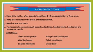 This document provides instructions for properly caring for clothes and personal belongings. It discusses hanging dirty and clean clothes, mending torn items, and folding accessories. It also outlines the steps for washing clothes, including sorting, soaking, soaping, rinsing and drying. Specific instructions are given for removing common stains like rust, ink, paint, blood, chewing gum, chocolate, coffee and urine. Finally, it covers ironing clothes, including preparing the ironing board and iron, dampening clothes, setting the iron temperature and hanging ironed clothes.