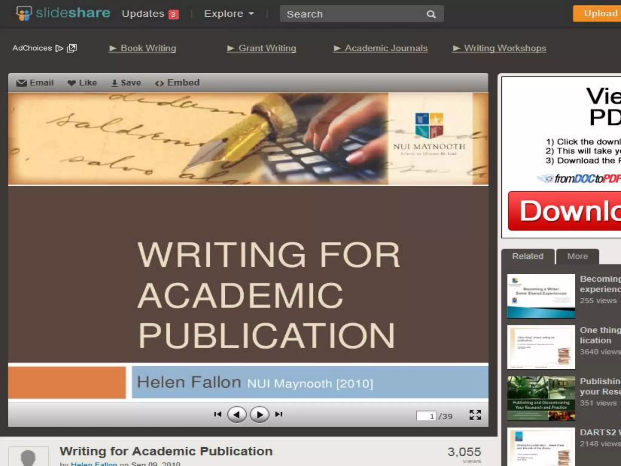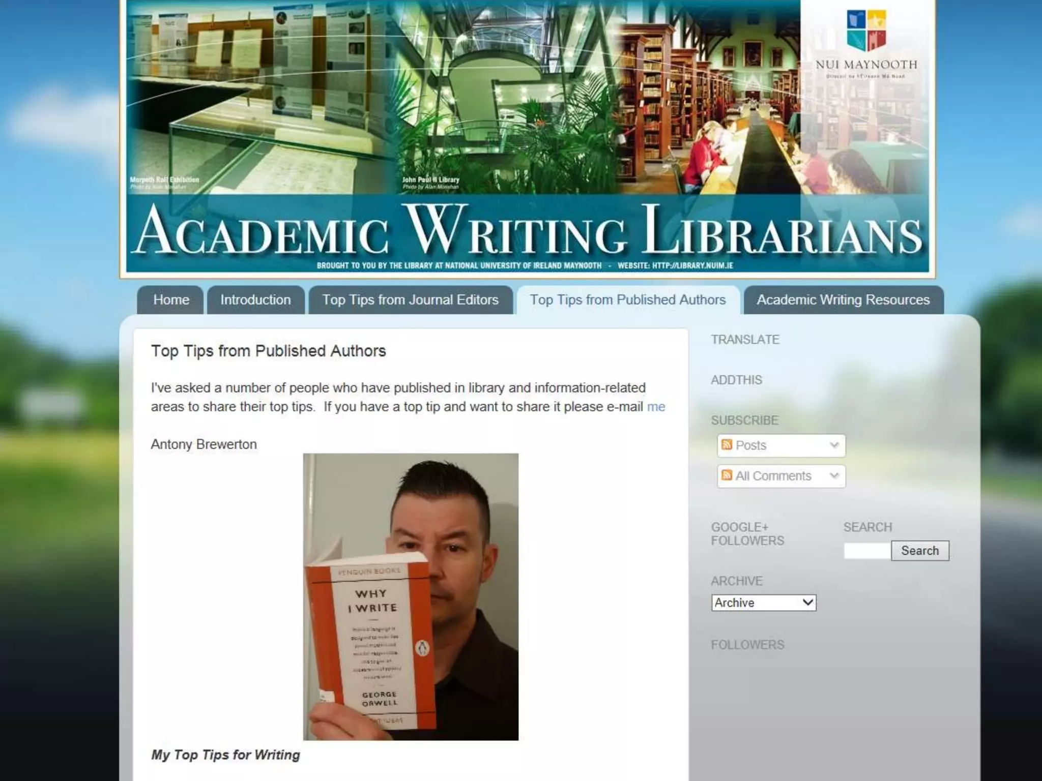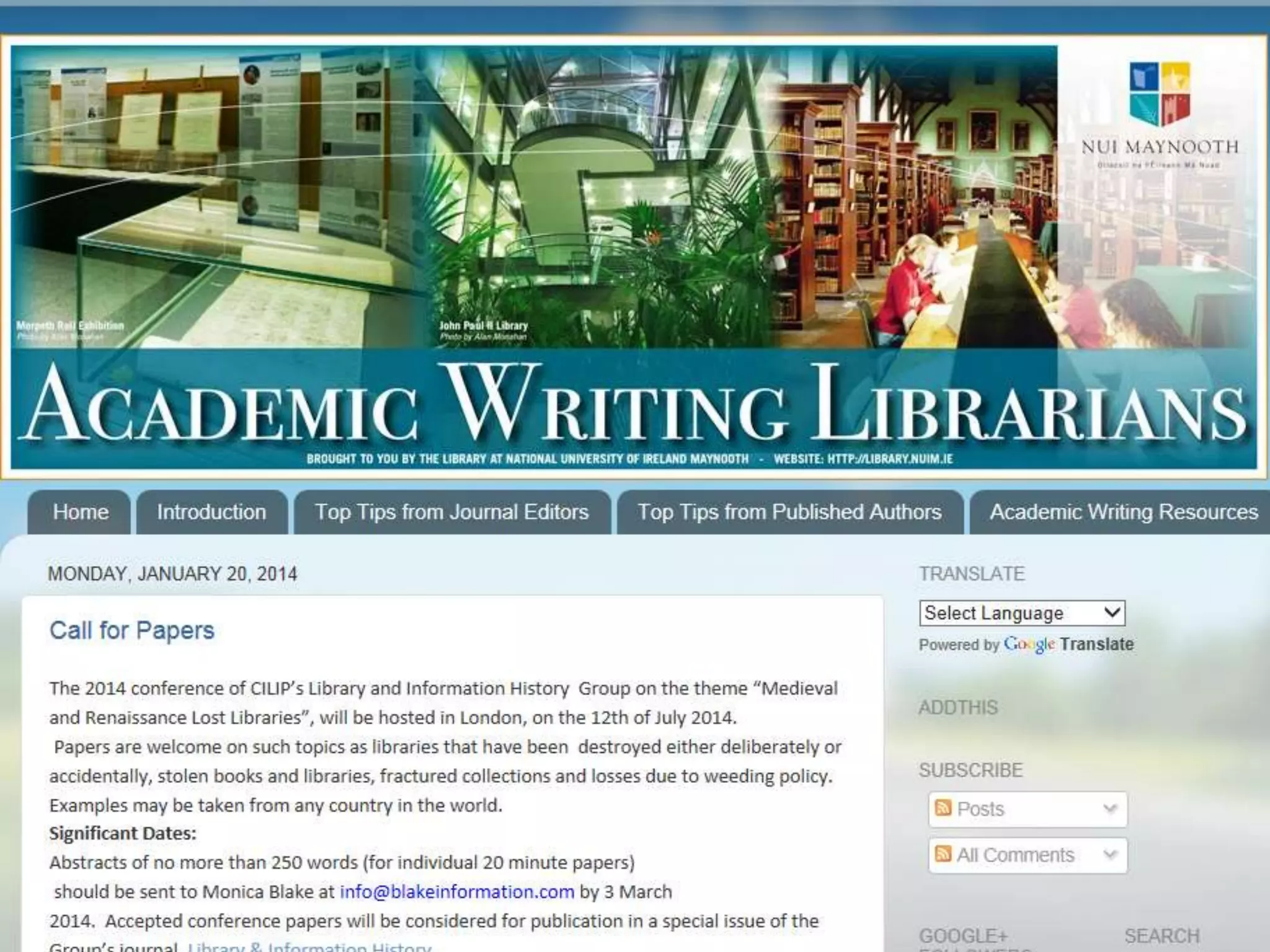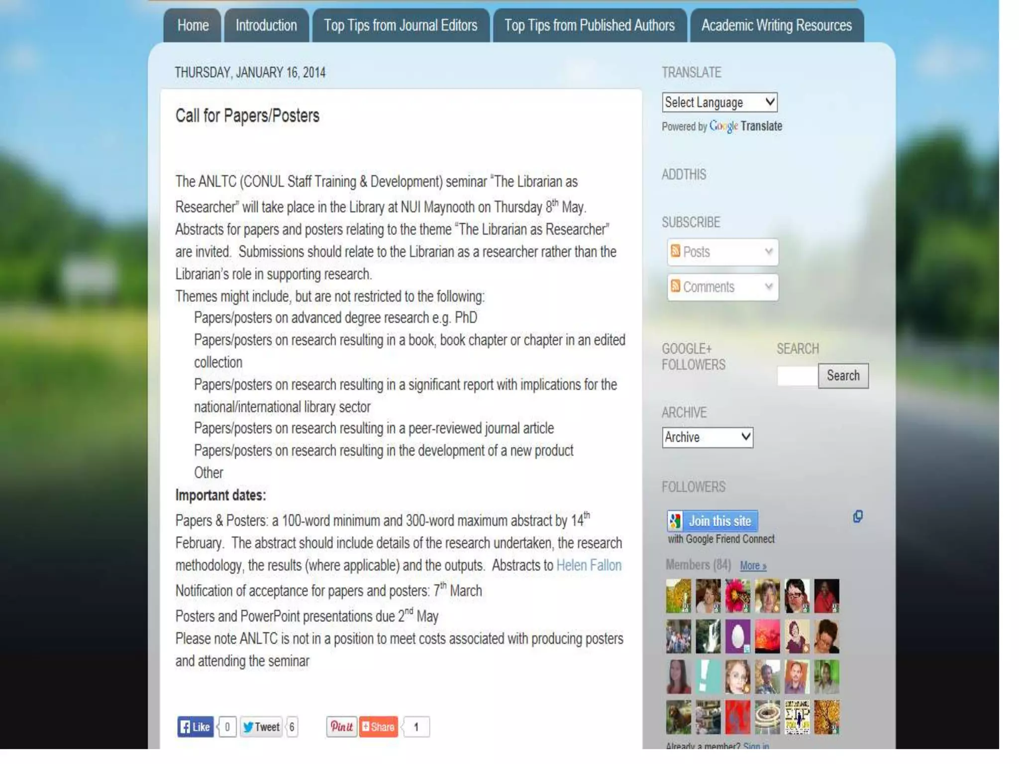 The document summarizes a blog called "Academic Writing Librarians Blog" that was created to promote and encourage academic writing among library staff. The blog provides opportunities for publishing and presenting such as notifications of calls for papers. It also offers writing resources like links to published papers and conference presentations. Additionally, the blog shares tips from published authors and journal editors. Statistics on page views from 2007 to 2013 are included, demonstrating growth over time. Charts break down page views by browser and country source to show the blog's readership. Instructions are provided at the end for following the blog via Twitter, website, email, or as an RSS feed.