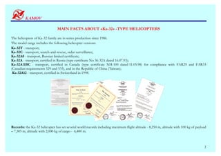 The KA-32 helicopters, in production since 1986, come in multiple variants tailored for tasks such as transport, search-and-rescue, and firefighting. They feature a coaxial rotor design for enhanced performance and maneuverability, the ability to transport heavy loads externally, and advanced avionics for operation in diverse conditions. Equipped with efficient TV3-117VMA engines, these helicopters have gained a reputation for reliability and versatility in various global operations.