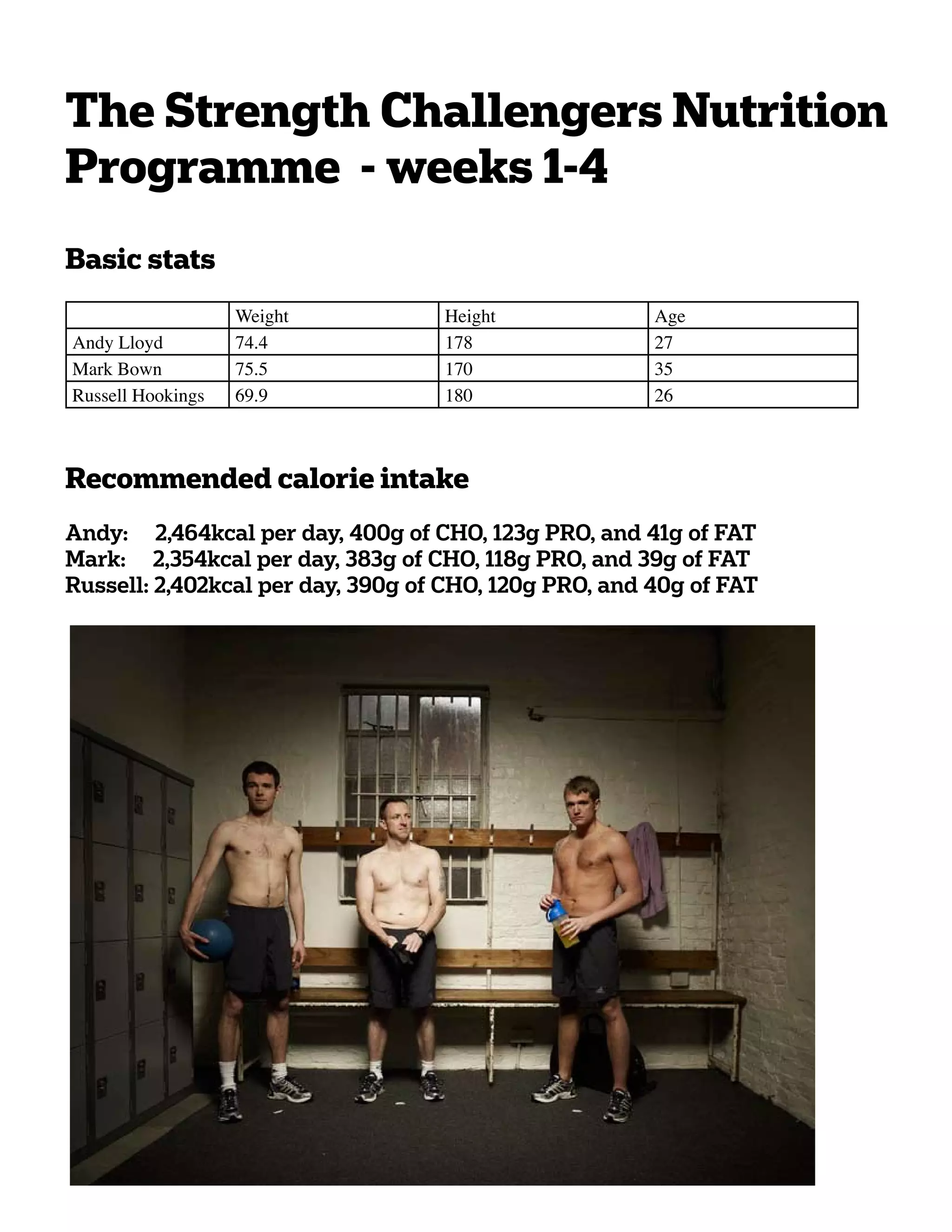 The document provides nutrition and calorie intake guidelines for three individuals - Andy, Mark, and Russell - participating in a 4-week strength training program. It recommends each individual consume a daily diet consisting of 65% carbohydrates, 20% protein, and 15% fat to provide enough fuel for exercise, muscle growth and recovery. Specific calorie and macronutrient intake amounts are outlined for each individual. The document also provides hydration guidelines and recommends nutritional supplementation with Lucozade Sport products before and after exercise to aid in recovery.