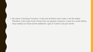 Sümeyye Yurtsever is the oldest of four siblings so she doesn't get much money from her parents. She works part-time at a nearby clothes shop on weekends and earns 25 Turkish Liras per month. She sometimes saves her earnings to buy perfumes that she enjoys people complimenting. In her free time, she likes visiting cafes in the city center where she treats herself to cake and lemonade.